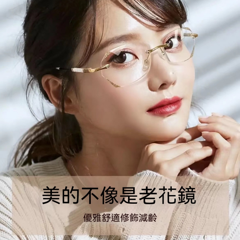 【鑽石細閃女士老花鏡】無邊框修飾臉型 高清老花鏡片視覺清晰 輕巧鏡架貼合臉龐 日常佩戴舒適又顯氣質